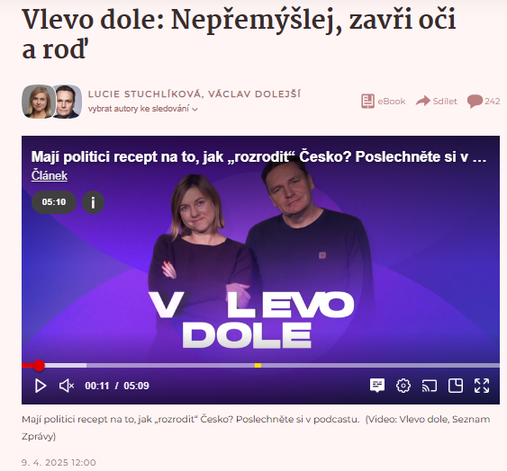 …bychom mohli říci o dramatickém poklesu porodnosti z 1,83 v roce 2021 na předpokládanou hodnotu 1,35 v roce 2024. Proč? Mít děti je výsledkem vzájemného působení velkého množství faktorů, o kterých zatím neuvažujeme.