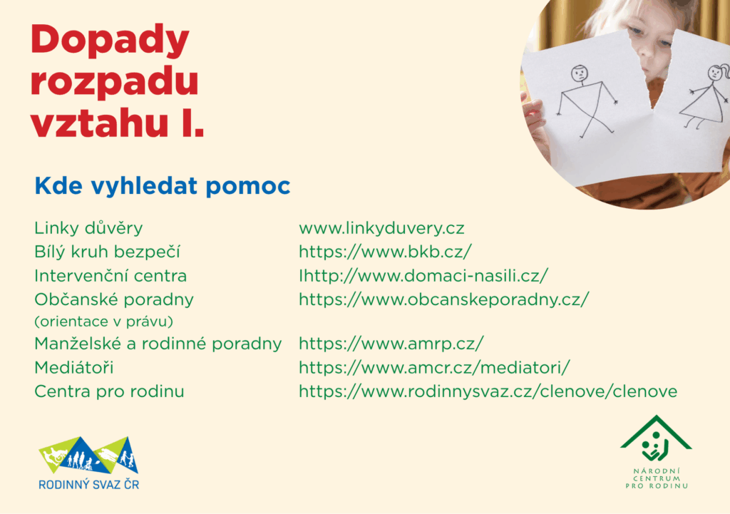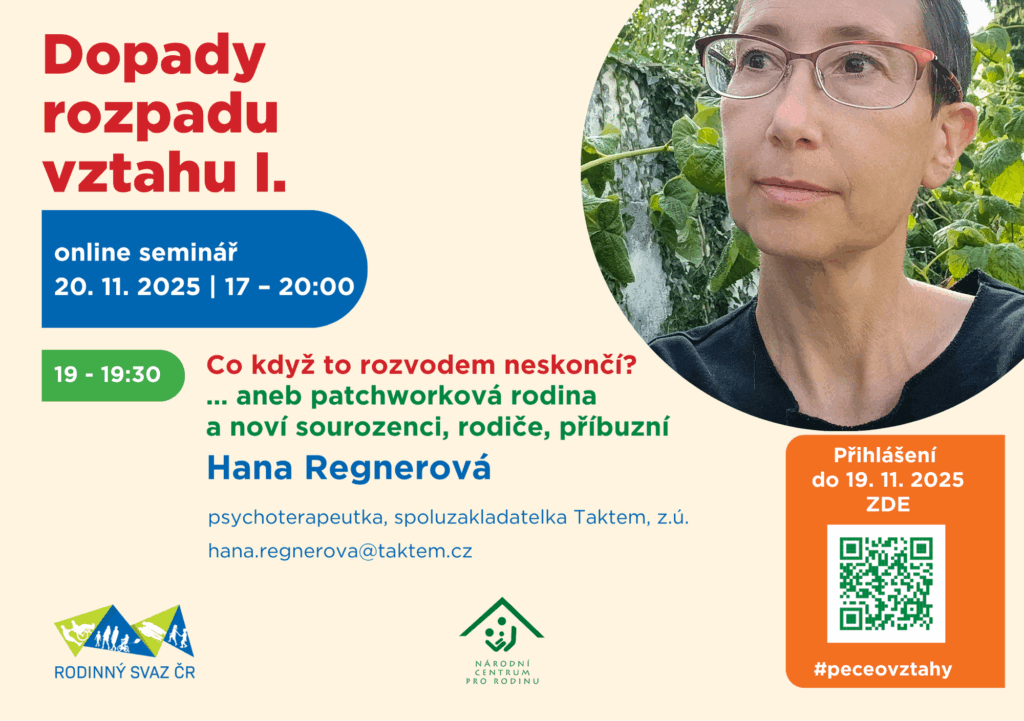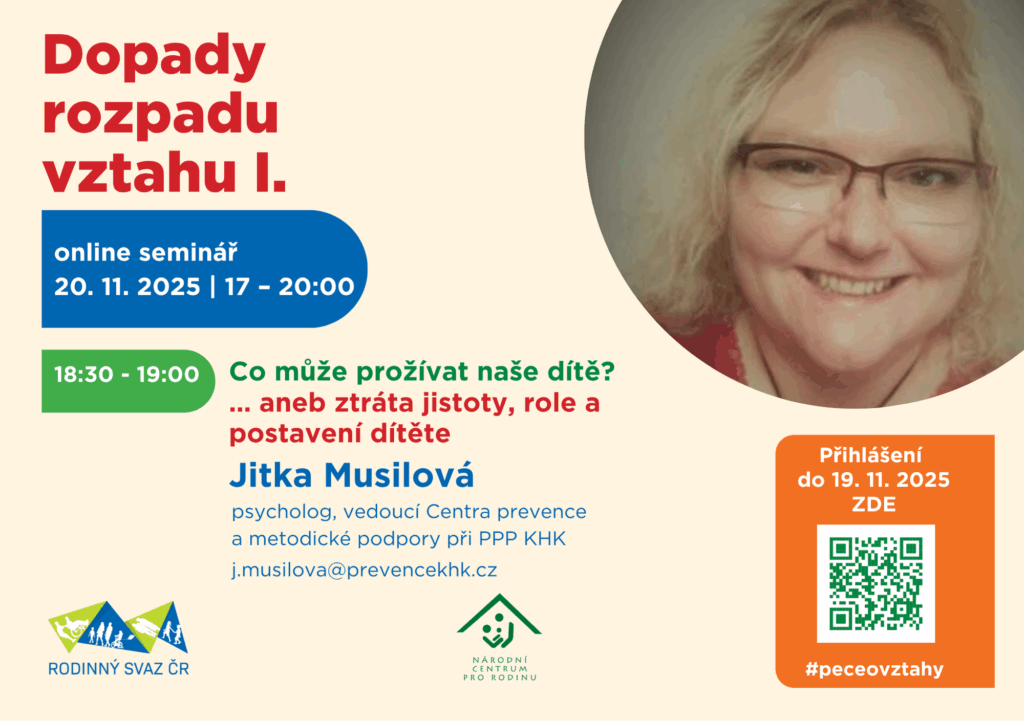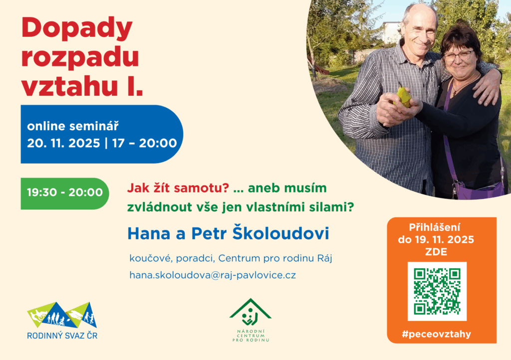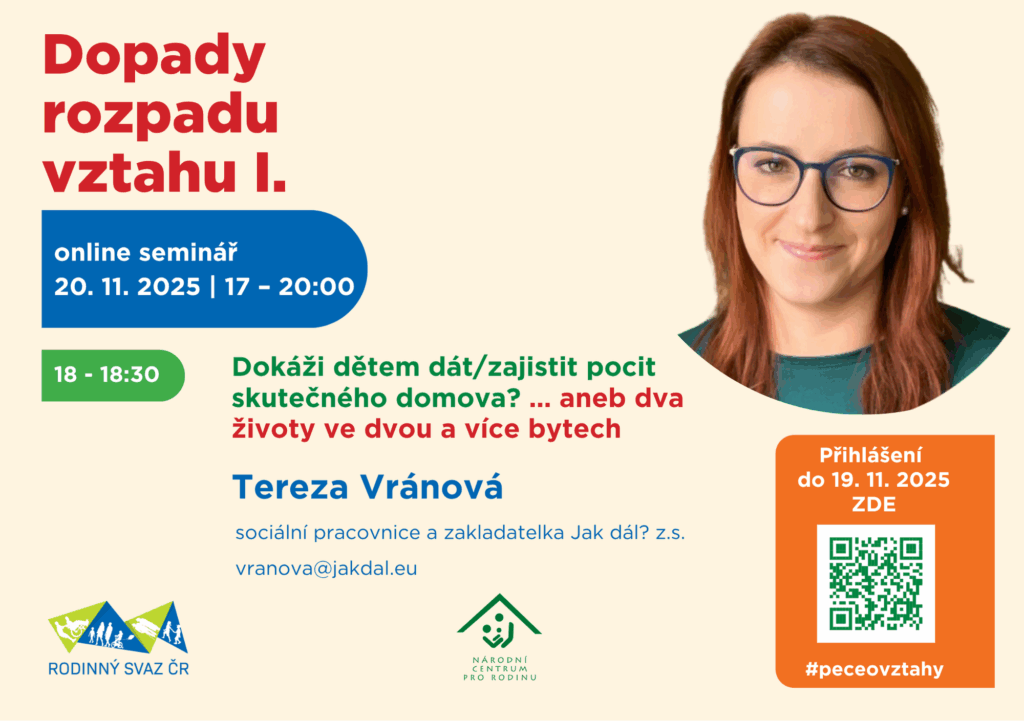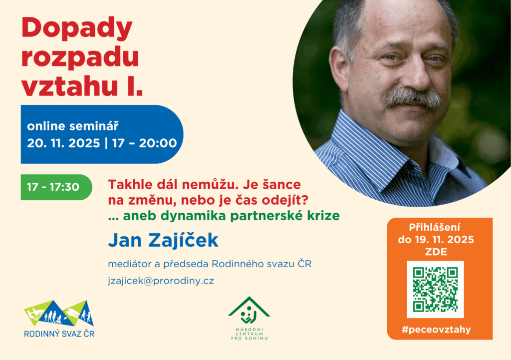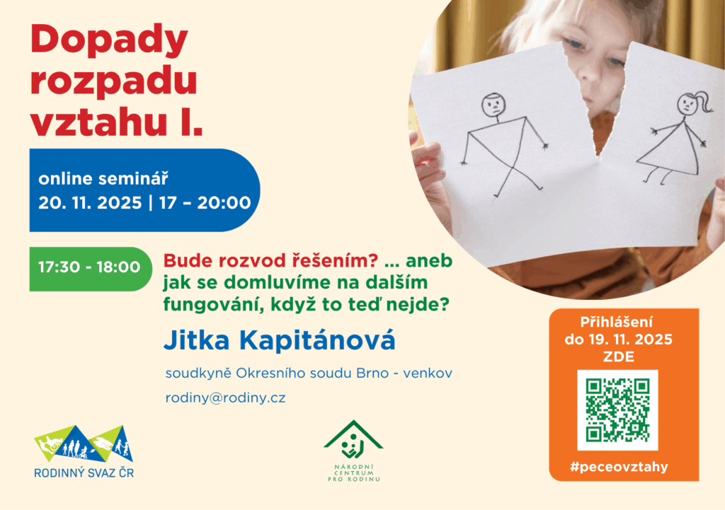 Národní centrum pro rodinu proto připravilo online seminář „Dopady rozpadu vztahu I.“, který nabídne šest věcných a otevřených přednášek odborníků z praxe – mediátora Jana Zajíčka, soudkyně JUDr. Jitky Kapitánové, sociální pracovnice a zakladatelky organizace Jak Dál? Terezy Vránové, psycholožky Mgr. Bc. Jitky Musilové, terapeutky MgA. Hany Regnerové z Taktem, z.ú. i koučů manželů Školoudových z Centra pro rodinu Ráj, z.s. Cílem není hodnotit ani dávat jednoduché návody, ale pomoci vidět širší souvislosti, pochopit, co se v rodině děje, a ukázat, kde hledat pomoc. Seminář se snaží být inspirací i pro odborníky, kteří podobné životní situace s lidmi sdílejí a provázejí je jimi.