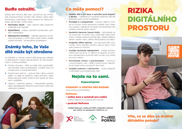 Národní centrum pro rodinu pro rodiče nabízí leták Digitální hrozby a jak se jim bránit Praktické rady pro rodiče, jak chránit děti v online prostředí.